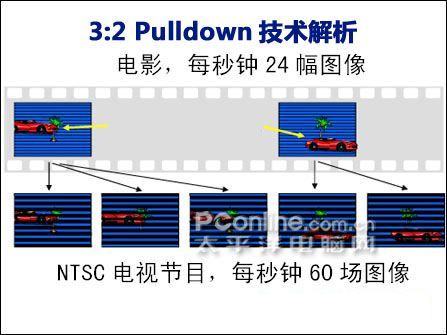 隨著逐行掃描DVD的出現(xiàn),也出現(xiàn)了逐行掃描電視機,這種電視機在接收逐行掃描的電視信號時,以NTSC信號為例,先要將60Hz的隔行電視信號,還原為電影原始的24幅完整圖像,再按3:2 Pulldown的方法,分配成60幅逐行掃描圖像顯示出來。