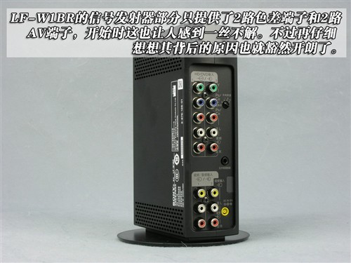 “LocationFree”LF-W1BR的信號發(fā)射器提供了2路色差端子和2路AV端子輸入,以及專用的IR紅外增強(qiáng)器端子。信號接收器部分則要簡單一些,提供了1個HDMI輸出端子和必要的電源接口和維修升級接口。
