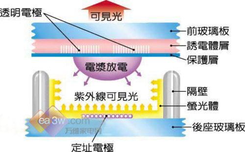 等離子技術(shù)原理:等離子顯示器( Plasma Display Panel)PDP的發(fā)光原理是在真空玻璃管中注入惰性氣體或水銀氣體,利用加電壓方式,使氣體產(chǎn)生等離子效應(yīng),放出紫外線,個(gè)別激發(fā)RGB三種不同的熒光體,產(chǎn)生不同三原色的可見光,并利用激發(fā)時(shí)間的長(zhǎng)短來(lái)產(chǎn)生不同的亮度。