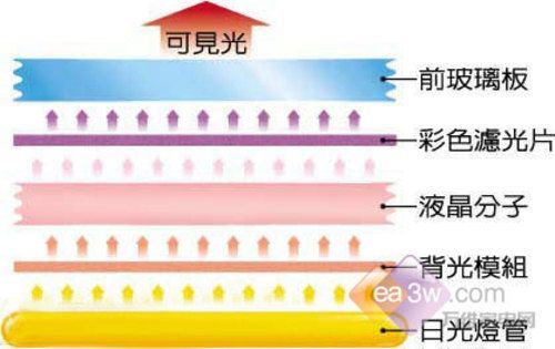 液晶技術(shù)原理:液晶投影顯示器( Liquid Crystal Display, LCD)LCD是靠后方一組日光燈管發(fā)光,然后經(jīng)由一組菱鏡片與背光模塊,將光源均勻地傳送到前方,依照所接收的影像訊號(hào),液晶畫素玻璃層內(nèi)的液晶分子會(huì)作相對(duì)應(yīng)的排列,決定哪些光線是需偏折或阻隔的。