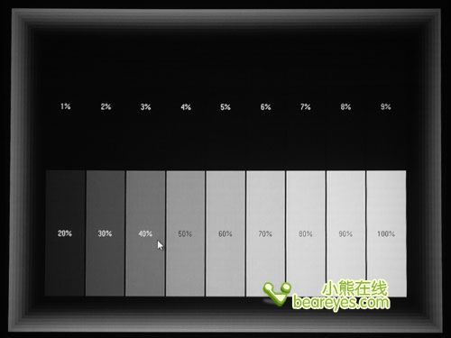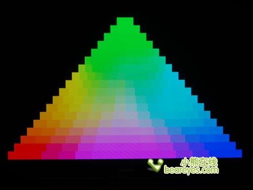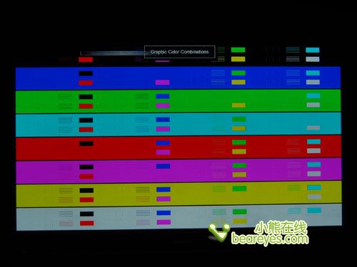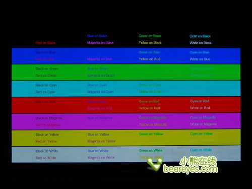 色彩鑲嵌測試表現(xiàn)一般,綠色與黃色有略為明顯的融色,適當(dāng)降低亮度會(huì)有好轉(zhuǎn),其他色彩搭配沒有問題。小熊在線www.beareyes.com.cn