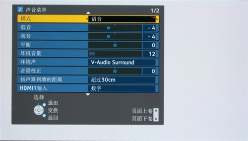 音頻菜單的內(nèi)容同樣沒有明顯改進(jìn),聲音模式只有語音和音樂兩種,并不是特別豐富。但是從其他選項(xiàng)的內(nèi)容來看,它的音頻可調(diào)整參數(shù)還是比較豐富的,適合有一定音頻欣賞水準(zhǔn)的用戶使用。