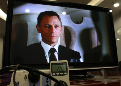 在標準圖像模式下,我們播放了一段1分鐘左右的高清影片,其中功率峰值是422W,最低值是116W,而大部分時間,功耗儀上的數(shù)字都是在200W-300W之間徘徊。