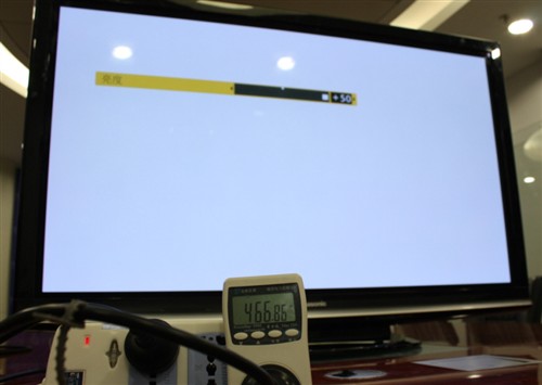 畫面全白意味著每一個像素都在發(fā)光。此時最高亮度下功耗為466W,最低亮度下功耗為428W,兩者差距約40W,不到10%。