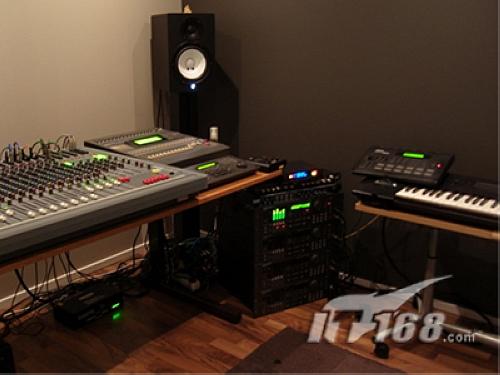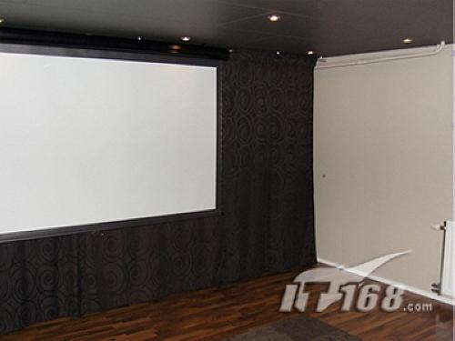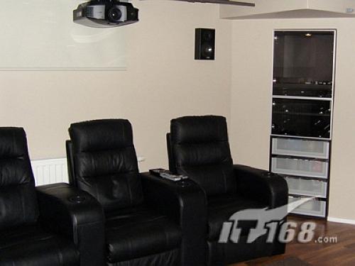 其次,追求空間上的干凈簡約。一般來說,影院室里的東西多比東西少好,這些東西會對聲波產(chǎn)生自然的吸收與反射作用,達到自然調(diào)節(jié)室內(nèi)殘響的作用。例如柜子、沙發(fā)、書架、CD架等都具有這種功能。而表面多纖維、多孔軟質(zhì)的東西則對高頻具有吸收作用,例如絨布沙發(fā)的表面,地毯厚絨布等等。然而,在森哥的影院室里,我們除了看見三張皮質(zhì)皇帝椅之外,很難發(fā)現(xiàn)有其它的雜物,整個空間都非?諘绾透蓛簟I缃忉,這除了自己不喜歡過于雜亂的空間之外,主要還是方便樂隊的日常排練。而且,干凈的空間使注意力更加能完全投入電影情節(jié)中。的確,筆者曾在在皇帝位看大片,覺得畫面大小相當適中,臨場感卻十足,但絲毫沒有感到壓迫感。值得一提的是,這個影院室的投影幕尺寸為210x118的碩大屏幕,這也是森哥為了實現(xiàn)當年許下的“要在超大屏幕上欣賞搖滾音樂”的愿望。