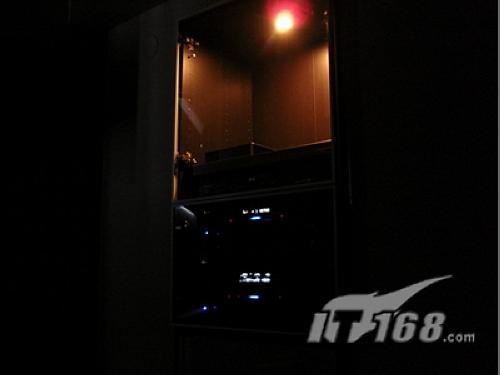 最后,寬大拉簾一舉三得。也許有人問,空間如此干凈,吸音與擴散效果就會略顯差。對于這個問題,森哥巧妙地采用了一張超寬的落地拉簾達到一舉三得的效果。這張沉色的大拉簾原本用途是作投投影幕的背景墻,相比白色的墻壁,投影幕的畫面會更加清晰與光亮。想不到,這一張拉簾拉上之后,不僅檔住了前面的矮柜,令空間更加干凈整潔,而且很好地將影院室與搖滾設備室作了一個間隔,讓影院室看上去更有一種真正電影院的專業(yè)感覺。而收到的意外驚喜是,厚實的拉簾起到相當不錯的吸音與擴散效果。同時,由于有寬大拉簾作阻隔,森哥并沒有將功放、碟機等設備放在前面的木柜里,而是將它們小心放在嵌墻的特制器材柜,而這個器材柜就安裝在座椅旁邊,伸手可及,非常方便。為了降低器材柜和房間的不協(xié)調(diào)感,燈光處理得很暗,這些設備的尺寸被盡可能地縮小。