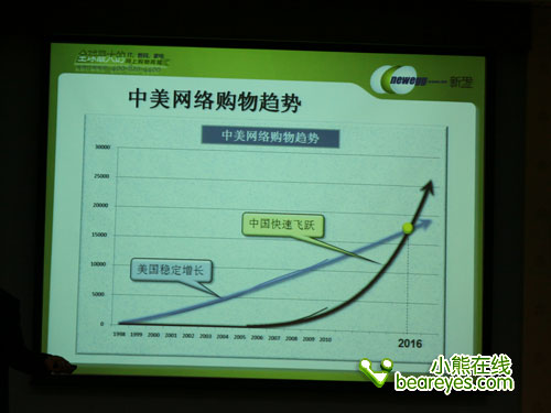 演講中,新蛋提供資料顯示,中國網(wǎng)購數(shù)量以高速增長,將于2016年超過美國,成為全球第一大網(wǎng)購市場,如果不排除人民幣升值等因素,超過沒時間有可能提前。