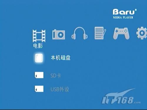 網(wǎng)影RM910采用了全新的藍底開機界面,看起來更加舒適,而且菜單的布局和PSP游戲機相似,操作起來也比較容易上手。其中橫向菜單分別為“電影”、“圖片”、“音樂”、“電子書”、“游戲”和“設(shè)置”,而縱向菜單則可以在本機磁盤、SD卡和USB設(shè)備中選擇,總的來說一目了然,見圖4。