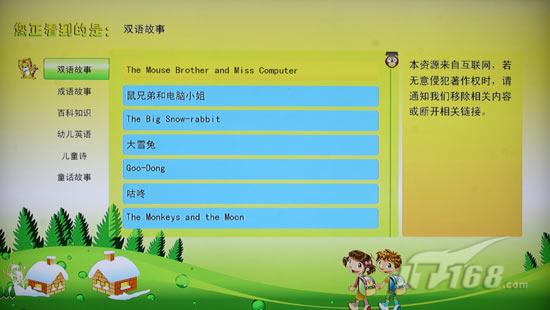教育部分的內(nèi)容包含幼教和清華網(wǎng)校,前者基于Flash提供諸如童話故事、成語解讀、百科知識之類的教育題材動畫,幫助幼兒自學(xué),內(nèi)容均通過網(wǎng)絡(luò)提供,相信內(nèi)容會源源不斷更新,清華網(wǎng)校與之前測試的清華同方機(jī)型很類似,提供針對不同年級課程階段的視頻下載,提供充足的補(bǔ)習(xí)知識,這部分由于公司網(wǎng)絡(luò)限制,暫無法體驗到。