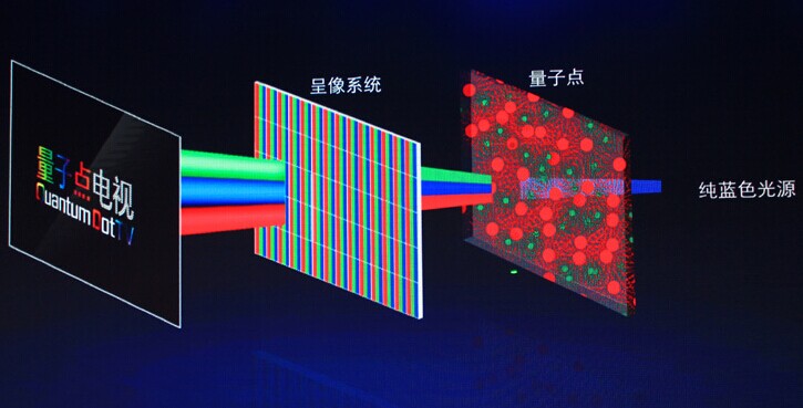 研究人們發(fā)現(xiàn)量子點(diǎn)的光電特性很獨(dú)特,它受到電或光的刺激,會根據(jù)量子點(diǎn)的直徑大小,發(fā)出各種不同顏色的非常純正的高質(zhì)量單色光,于是便產(chǎn)生了將量子點(diǎn)顯示技術(shù)應(yīng)用到電視上的構(gòu)思。經(jīng)過不斷的開發(fā),TCL研發(fā)團(tuán)隊(duì)最終實(shí)現(xiàn)了通過純藍(lán)光源,激發(fā)量子點(diǎn)光管中不同尺寸的量子點(diǎn)晶體,從而釋放純紅光子和純綠光子,并與剩余的純藍(lán)光投射到呈像系統(tǒng)上面,這樣就可以借助量子點(diǎn)發(fā)出能譜集中、非常純正的高質(zhì)量紅/綠單色光,完全超越傳統(tǒng)LED背光的熒光粉發(fā)光特性,實(shí)現(xiàn)更佳的成像色彩。