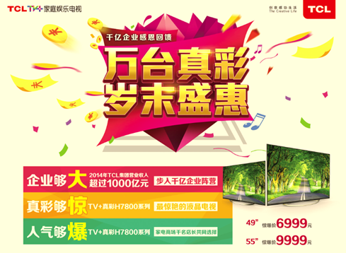 據(jù)悉為了慶賀榮登千億企業(yè),1月23日到25日,TCL將盛大舉辦主題為“千億企業(yè)感恩回饋,萬臺真彩歲末盛惠”的鉅惠活動。屆時,TCL 不僅將投入萬臺TV+真彩H7800全力助陣,以史無前例的優(yōu)惠價傾情回饋,此外TV+量子點電視H9700、超高性價比的4K電視A571U也參與此次促銷活動,為一直以來支持TCL的消費者送上最大歲末感恩回饋。