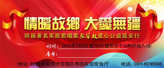 為傳承和弘揚(yáng)中華名族的優(yōu)秀傳統(tǒng)文化, 并以爰心獻(xiàn)真情, 關(guān)愛(ài)兒童, 文化扶貧, 由中國(guó)關(guān)心下一代工作委員會(huì)等多家機(jī)構(gòu)聯(lián)合主辦的'情暖故鄉(xiāng), 大愛(ài)無(wú)疆'陜籍著名女高音歌唱家張華敏愛(ài)心公益-延安行活動(dòng), 即將開(kāi)始。