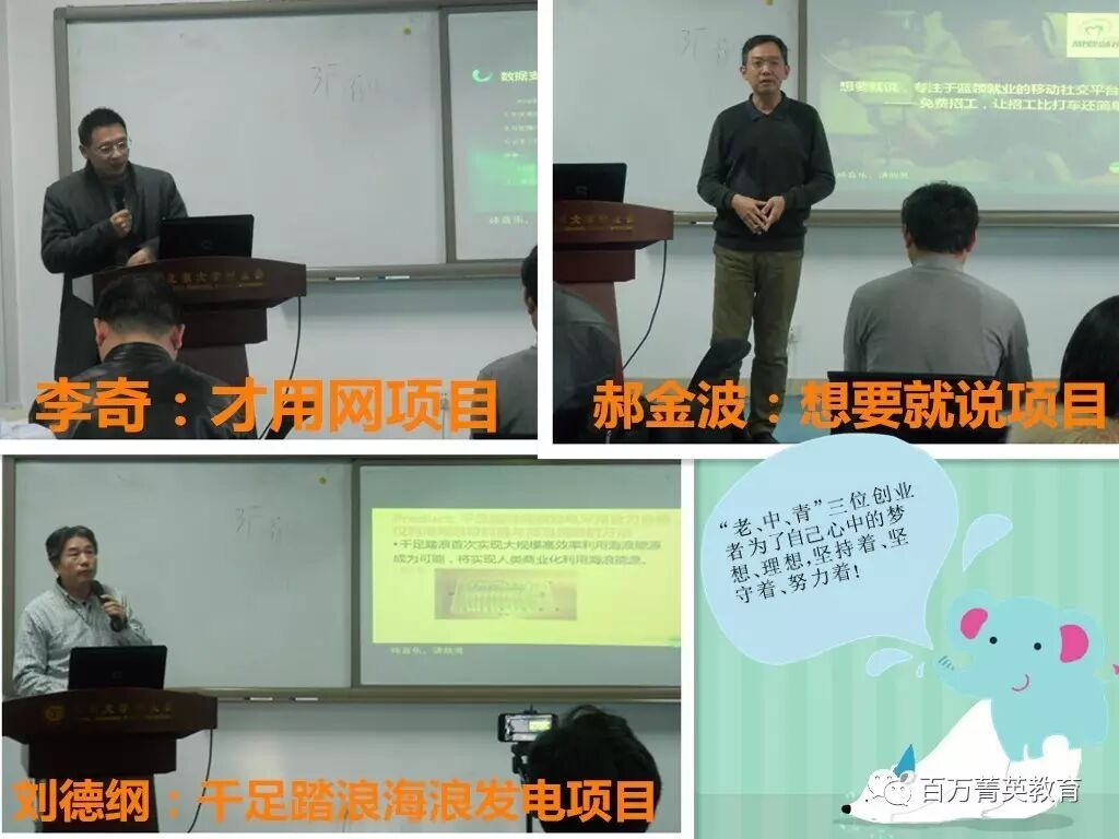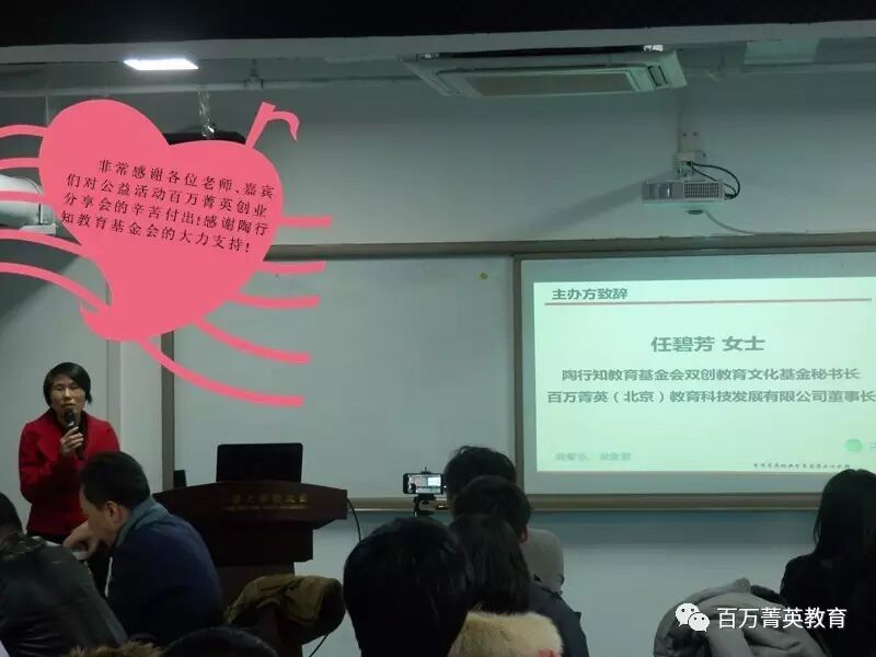 任秘書長(zhǎng)還講述到百萬菁英之所以偉大,是因?yàn)閾碛幸粋(gè)有共同情懷的優(yōu)秀企業(yè)家、創(chuàng)業(yè)&評(píng)審導(dǎo)師、投資人、高校專家等組成的百萬菁英雙創(chuàng)教育導(dǎo)師團(tuán)在默默付出和支持。百萬菁英創(chuàng)業(yè)分享會(huì)正是在雙創(chuàng)教育導(dǎo)師團(tuán)導(dǎo)師們的幫助下,才能在眾創(chuàng)空間和孵化器舉辦,并且走進(jìn)高校。創(chuàng)業(yè)分享會(huì)至今已成功輔導(dǎo)過上百個(gè)創(chuàng)業(yè)項(xiàng)目,獲得了大學(xué)生、青年創(chuàng)業(yè)朋友們和社會(huì)人士的高度認(rèn)可和好評(píng)。2017年,百萬菁英創(chuàng)業(yè)分享會(huì)還將走進(jìn)全國(guó)千所高校,創(chuàng)業(yè)群體最多的地區(qū)舉辦,開啟創(chuàng)業(yè)教育,教育輔導(dǎo)等活動(dòng),還將創(chuàng)辦“大學(xué)生雙創(chuàng)基地”;舉辦大型的國(guó)際雙創(chuàng)峰會(huì)、公益創(chuàng)業(yè)論壇、女性創(chuàng)業(yè)峰會(huì)等。同時(shí),在條件力量允許的情況下,我們也希望通過公益基金支助到早期的創(chuàng)業(yè)項(xiàng)目,把最艱難的這段路走得更好。反之,也希望各位老師們,特別是接受到基金支助的創(chuàng)業(yè)項(xiàng)目,能有心懷感恩之心,在你項(xiàng)目有機(jī)會(huì)發(fā)展的同時(shí),能夠反哺支持專項(xiàng)基金,讓公益持續(xù),讓愛心傳承!推動(dòng)中國(guó)公益創(chuàng)業(yè)、公益事業(yè)、公益產(chǎn)業(yè)的發(fā)展。