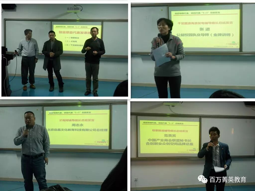 想要就說項(xiàng)目組組長(zhǎng)范貴賓先生、才用網(wǎng)項(xiàng)目組組長(zhǎng)周志永先生、千足踏浪海浪發(fā)電項(xiàng)目組組長(zhǎng)張進(jìn)女士三位組長(zhǎng)把“多對(duì)一輔導(dǎo)”環(huán)節(jié)導(dǎo)師們給項(xiàng)目創(chuàng)始人的評(píng)價(jià)、建議做了詳盡的總結(jié)。三位創(chuàng)業(yè)項(xiàng)目創(chuàng)始人對(duì)導(dǎo)師們輔導(dǎo)及平臺(tái)發(fā)表感言:三個(gè)項(xiàng)目創(chuàng)始人都非常感恩專家和導(dǎo)師們點(diǎn)評(píng)輔導(dǎo),感謝陶行知教育基金會(huì)雙創(chuàng)教育文化基金、智囊傳媒和百萬菁英教育平臺(tái)及各位愛心導(dǎo)師們的辛苦付出,創(chuàng)業(yè)雖然艱難,但他們相信在這么多導(dǎo)師們、愛心人士的幫助下會(huì)越來越有信心,把項(xiàng)目做好,請(qǐng)大家拭目以待!