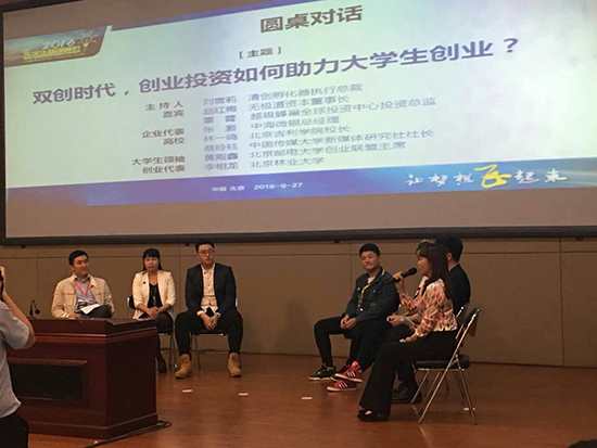 清創(chuàng)孵化器執(zhí)行總裁劉雪莉女士在主持圓桌對話,來自無極道資本董事長趙紅梅女士、超級蜂巢全球投資中心投資總監(jiān)雷霄、中海微銀總經(jīng)理張灝、北京吉利學(xué)院校長林一鳴,以及大學(xué)生領(lǐng)袖代表中國傳媒大學(xué)新媒體研究社社長蔡玲玨、北京郵電大學(xué)創(chuàng)業(yè)聯(lián)盟主席黃殿鑫和北京林業(yè)大學(xué)創(chuàng)業(yè)代表李相龍,一起進(jìn)行了圓桌對話。投資界代表、企業(yè)代表、高校代表、大學(xué)生領(lǐng)袖和大學(xué)生創(chuàng)業(yè)代表一起暢談在雙創(chuàng)時代,創(chuàng)業(yè)投資如何助力大學(xué)生創(chuàng)業(yè)的話題。