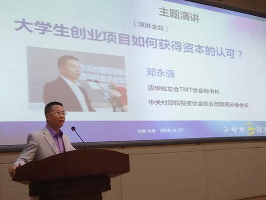 清華校友會TMT協(xié)會秘書長鄧永強(qiáng)在演講“大學(xué)生創(chuàng)業(yè)項(xiàng)目如何如何得到資本的認(rèn)可?”