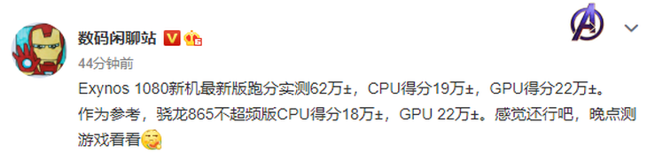11月30日消息,今日,數(shù)碼博主:@數(shù)碼閑聊站在社交平臺發(fā)布內(nèi)容,其內(nèi)容顯示配備三星新SOC——Exynos 1080的新機(jī)跑分大致為62萬左右,CPU得分19萬左右,GPU得分22萬左右。