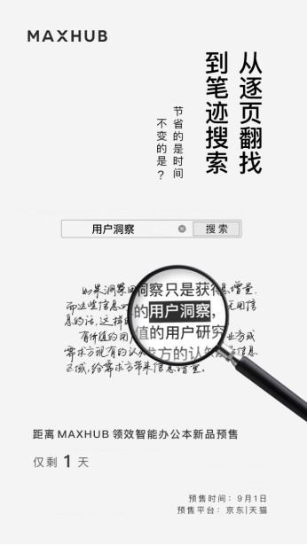 其實,根據(jù)MAXHUB領(lǐng)效今天發(fā)布的海報,我們已經(jīng)能夠看出一些端倪,比如其文案中提到的一個新的關(guān)鍵詞“筆記搜索”,應(yīng)該就是MAXHUB領(lǐng)效這次為新品所配備的關(guān)鍵功能了。我們以前使用紙質(zhì)筆記本時,查找過往筆記常常需要一頁頁地翻閱,即使是當(dāng)下很多先進(jìn)的電子產(chǎn)品,在查閱內(nèi)容方面也比較繁瑣耗時,幾乎都還沒有做到盡善盡美。因此,如果MAXHUB領(lǐng)效新品能夠做到根據(jù)字跡一鍵定位筆記內(nèi)容,那無疑會大大降低查找時間,必然會受到惜時如金的商務(wù)人士的青睞。